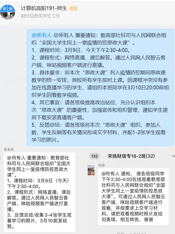 | 在举国上下万众一心、众志成城做好新冠肺炎疫情防控工作的特殊时刻,为将高校思政课教学优势转化为防疫斗争的强大力量,引导广大学生增强“四个意识”、坚定“四个自信”、做到“两个维护”,教育部社会科学司、人民网联合举办“全国大学生同上一堂疫情防控思政大课”。 信息管理学院接到上级通知后,认真布置此项工作,第一时间通过微信、钉钉班级群通知到各班级同学,并于3月9日下午组织学院全体师生通过网络共上一堂思政大课。 课上,艾四林、秦宣、王炳林、冯秀军4位教授分别结合《马克思主义基本原理概论》、《毛泽东思想和中国特色社会主义理论体系概论》、《中国近现代史纲要》和《思想道德修养与法律基础》4门必修思政课教学内容,为同学们解读党中央在疫情防控期间的决策部署,分析中国共产党的领导集中统一领导和中国特色社会主义制度的显著优势,讲述防疫抗疫一线的感人故事,发挥高校思政课落实立德树人根本任务的关键课程作用。 信息管理学院共有34个班级1036名学生在线观看了本次疫情防控思政大课,直播结束后,同学们纷纷拿起笔写下了自己的感悟,大家纷纷表示,四位教授的讲授引人入胜,内容触动心灵,领悟了真正的中国精神,也明白了自己责任与担当,身为青年学生定会更加坚定理想信念,勇担社会责任,不辜负这个伟大的时代,努力争做德智体美劳全面发展的社会主义建设者和接班人。 (供稿:信息管理学院)