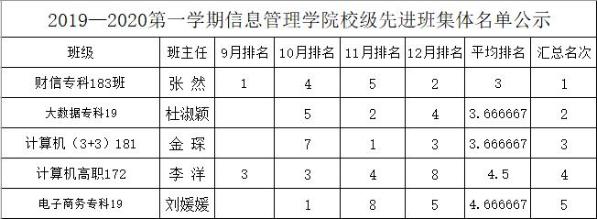 2019-2020-1学期我系共有5个校优秀班集体名额,经系党政联席会讨论,现根据上学期各月班级排名取平均值(分数低的排名靠前),现进行公示,公示期至5月2日12时。如有疑问请与梅小东老师联系。