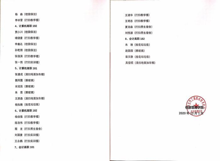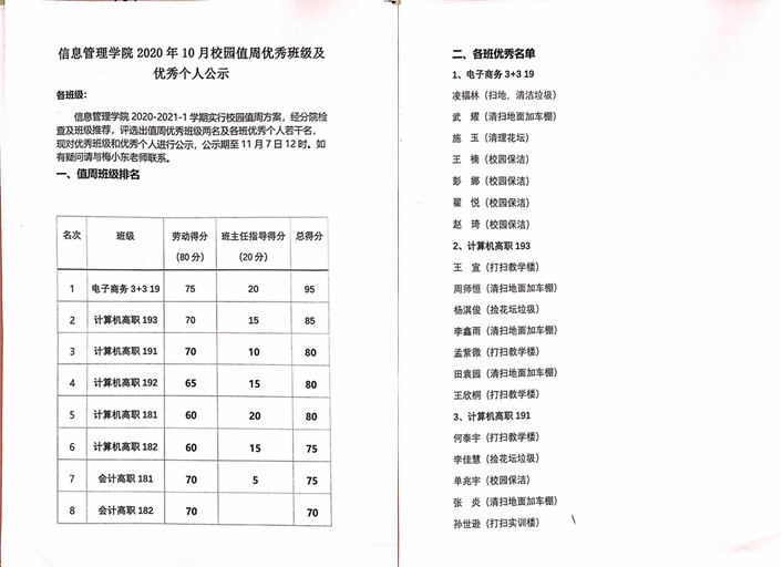 信息管理学院2020年10月校园值周优秀班级及优秀个人公示