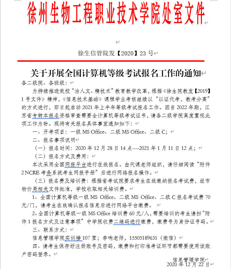 徐生信管院发〔2020〕23号关于开展全国计算机等级考试报名工作的通知.doc