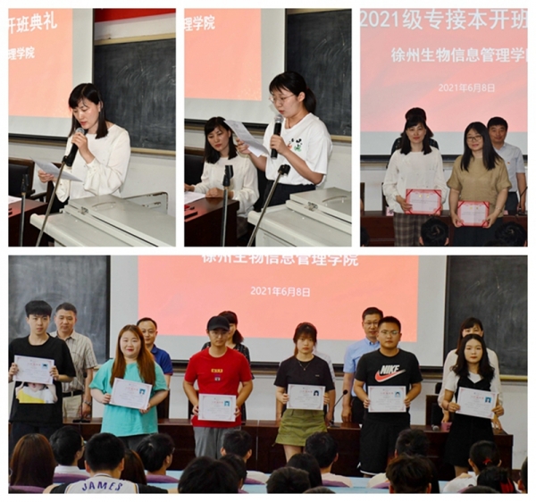 6月8日上午10点,信息管理学院2021级接本班级开班典礼在云龙校区实训楼一楼阶梯教室举行。校党委副书记秦越华,南京邮电大学继续教育学院副院长秦桂娟、教学部主任于国俊,教务处处长史先振,信息管理学院院长袁剑锋、专接本负责人蒋瑞芳、本科班班主任及128名接本学生参加了本次活动。开班典礼由袁剑锋院长主持。