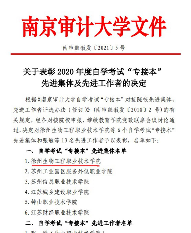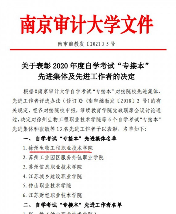 近日,南京审计大学公布《关于表彰 2020 年度自学考试“专接本”先进集体及先进工作者的决定》,徐州生物工程职业技术学院被评为自学考试“专接本” 先进集体。