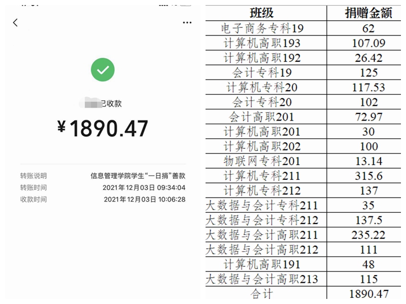 本着“坚持自愿 鼓励奉献”的原则,各班级积极响应,慷慨解囊、献出了自己的一份爱心。同学们纷纷表示,虽然现在能捐的钱不多,但是想到这些钱可能给那些贫困生活的人带来帮助,我们觉得很有成就感、很自豪。最终,信息管理学院共募集善款 1890.47元。