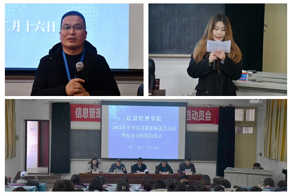 为切实做好我院学生的实习就业工作,检验学校“治人文,精技术”教育教学改革成效,拓展学生实习就业渠道,实现校企良性互动,12月16日上午10:00,信息管理学院2021年冬季实习就业双选暨校企合作签约仪式在实训楼113成功举行。学校党委委员、副校长赵虎,教务处处长史先振,信息管理学院院长袁剑锋、江苏长电科技股份有限公司人力资源总监井维永等企业代表及学生代表等100余人参加启动仪式。信管学院学工党支部书记、学生科科长马文瑾主持仪式。