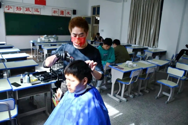 理发现场,一张椅子,几把剪刀,撑起了一个临时理发店。理发师详细了解“顾客“的需求,沟通设计后挥动着手中的剪刀,熟练、利落地为同学们理出了一个个整洁的发型,娴熟的技术和热情周到的服务得到了同学们的一致称赞。