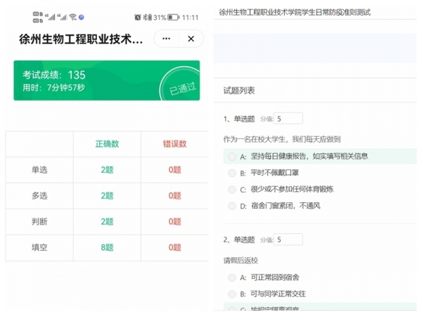 为检验同学们对学校疫情防控准则的理解和掌握程度,学院通过“钉钉云课堂”发布了日常防疫准则测试,将学习成果转化为武装头脑、自觉遵守执行的行动自觉,为疫情防控提供坚实保障。