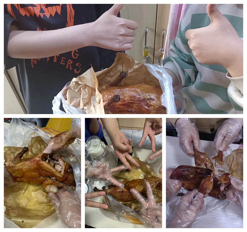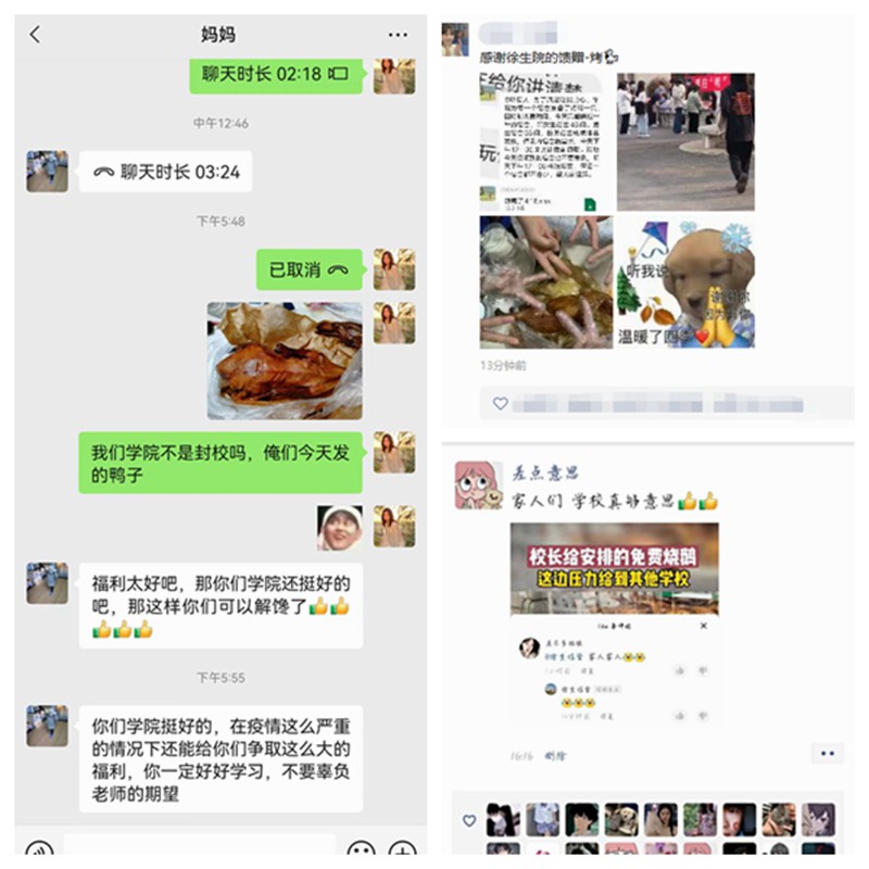 一个个经精心烤制后的烤鸭,在对外包装进行严格的消杀后送到了同学们的手中。烤鸭的一传一递间,学院送来的不仅是美食,更是寄托着满满关怀与关爱。一只只美味的烤鸭,不仅仅让同学们填饱了肚子,更获得了心情的愉悦和满足。面对学院的“实力宠爱”,同学们纷纷在微信群、朋友圈表达了自己的感谢。