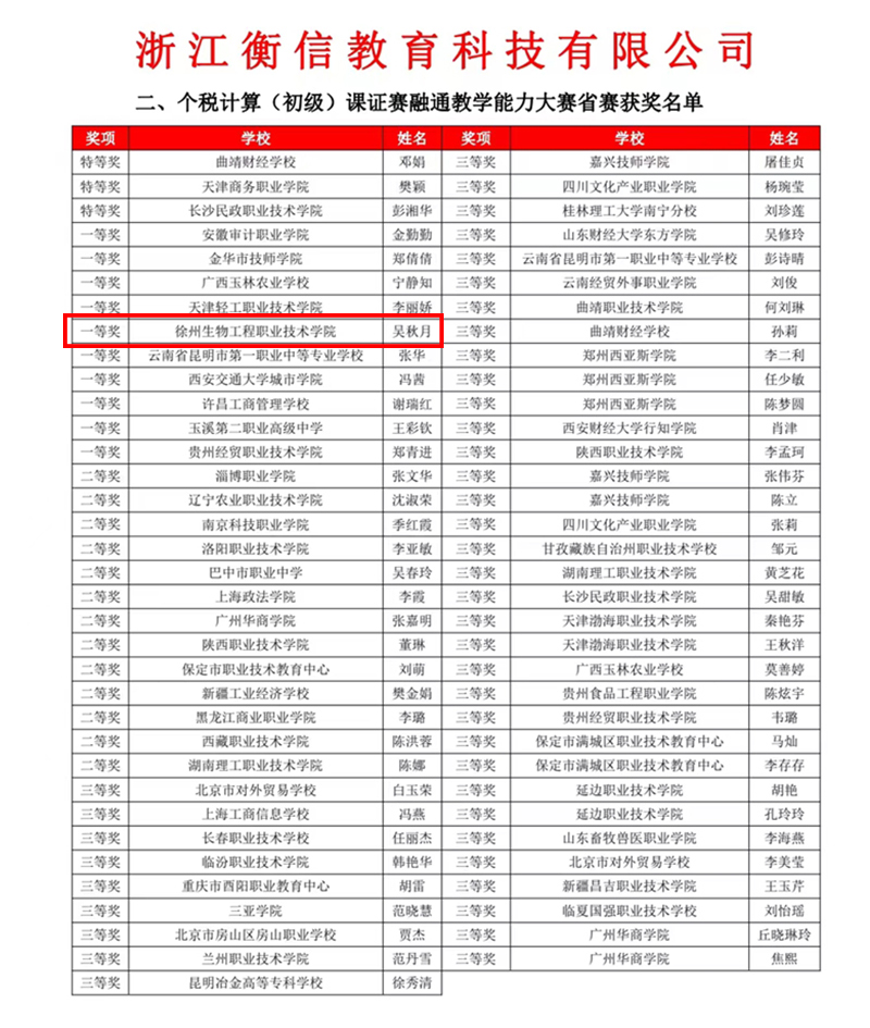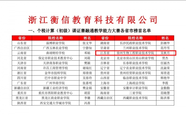 2022 年第一届“衡信杯”全国院校教师个税计算(初级)课证赛融通教学能力大赛省赛获奖名单近日揭晓。我院吴秋月老师的参赛作品《美好生活,与个税同行—专项附加扣除》荣获一等奖,位列江苏省第一名。